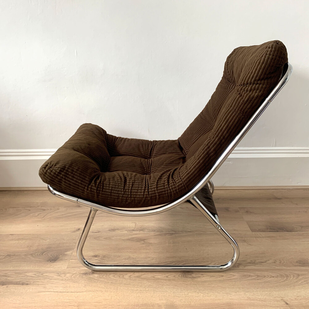 Mid Century Lounge Chair by renowned British designer Peter Hoyte. 1970s Original brown corduroy upholstery on canvas sling, with a tubular chrome sled base.