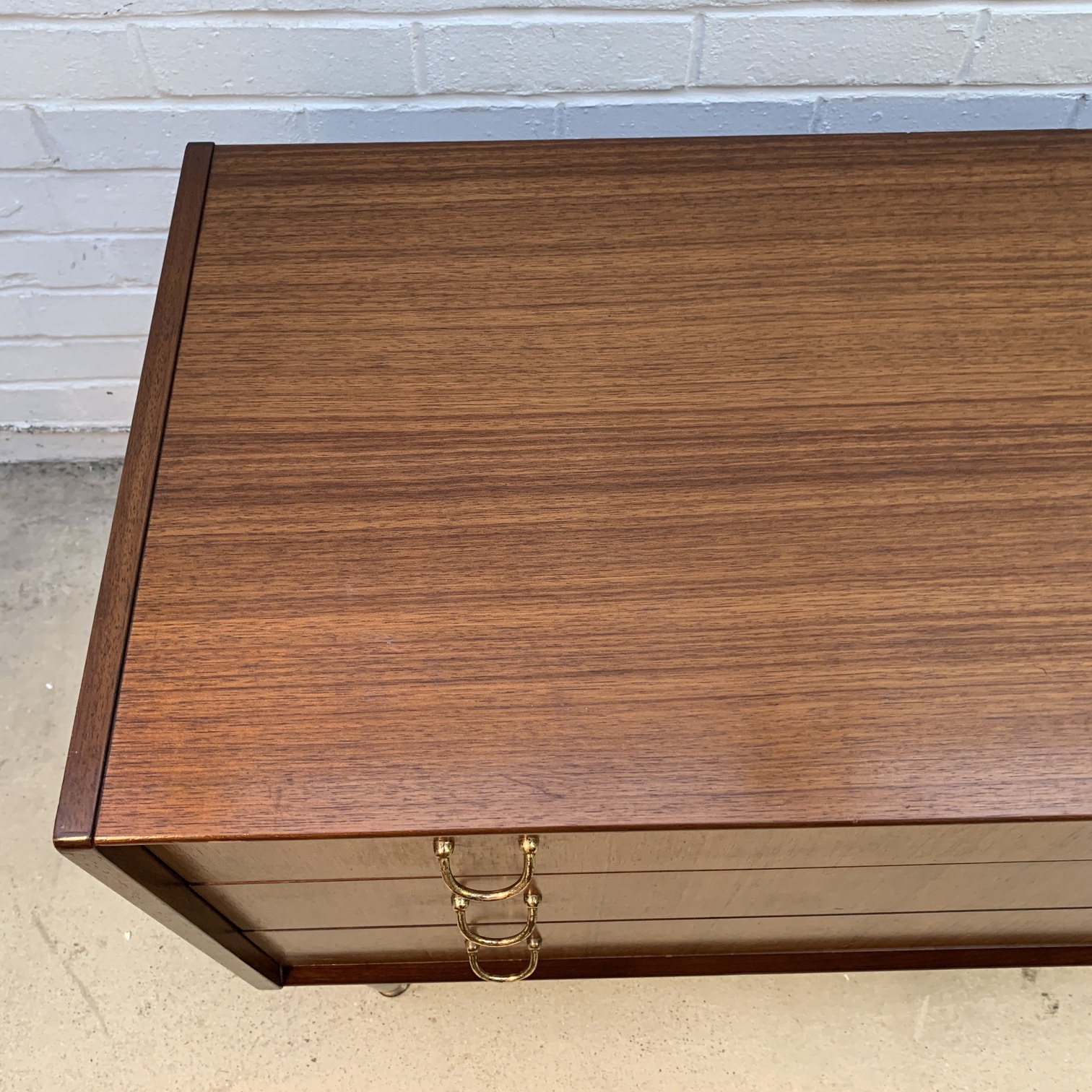 This is a stunning chest of drawers by G-Plan. It is from the Tola & Black range, often referred to as Librenza. It is a three drawer chest in tola wood with super stylish, semi-gloss black legs.