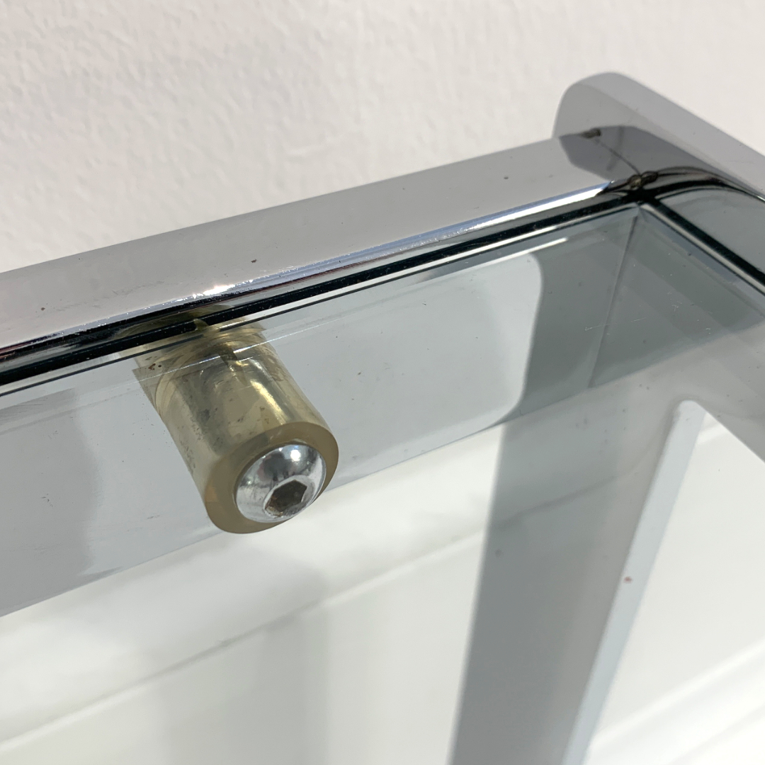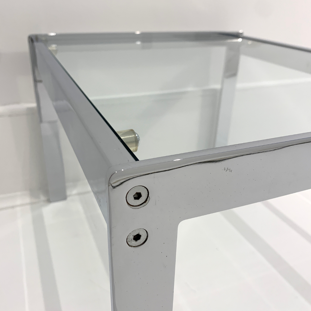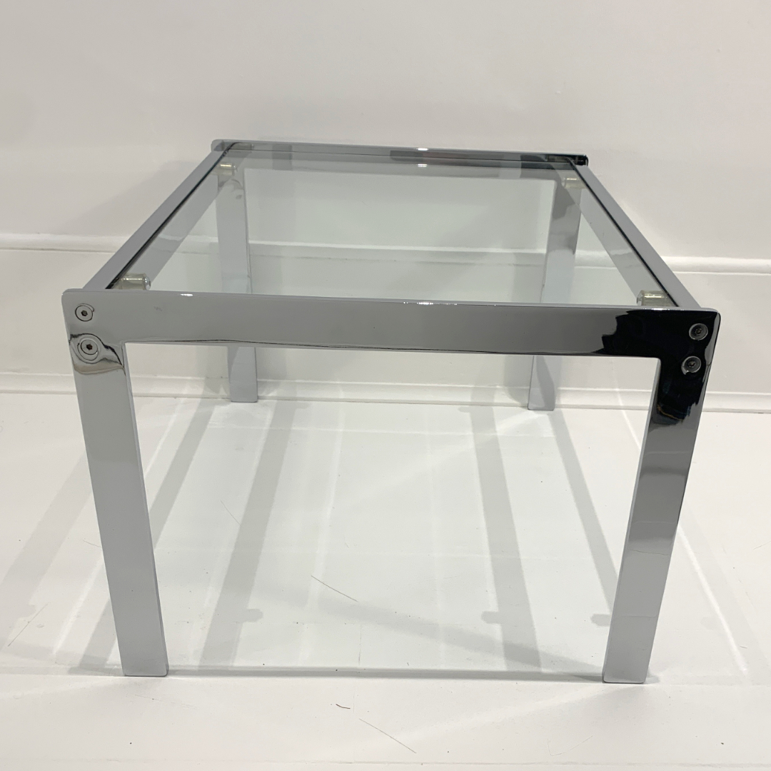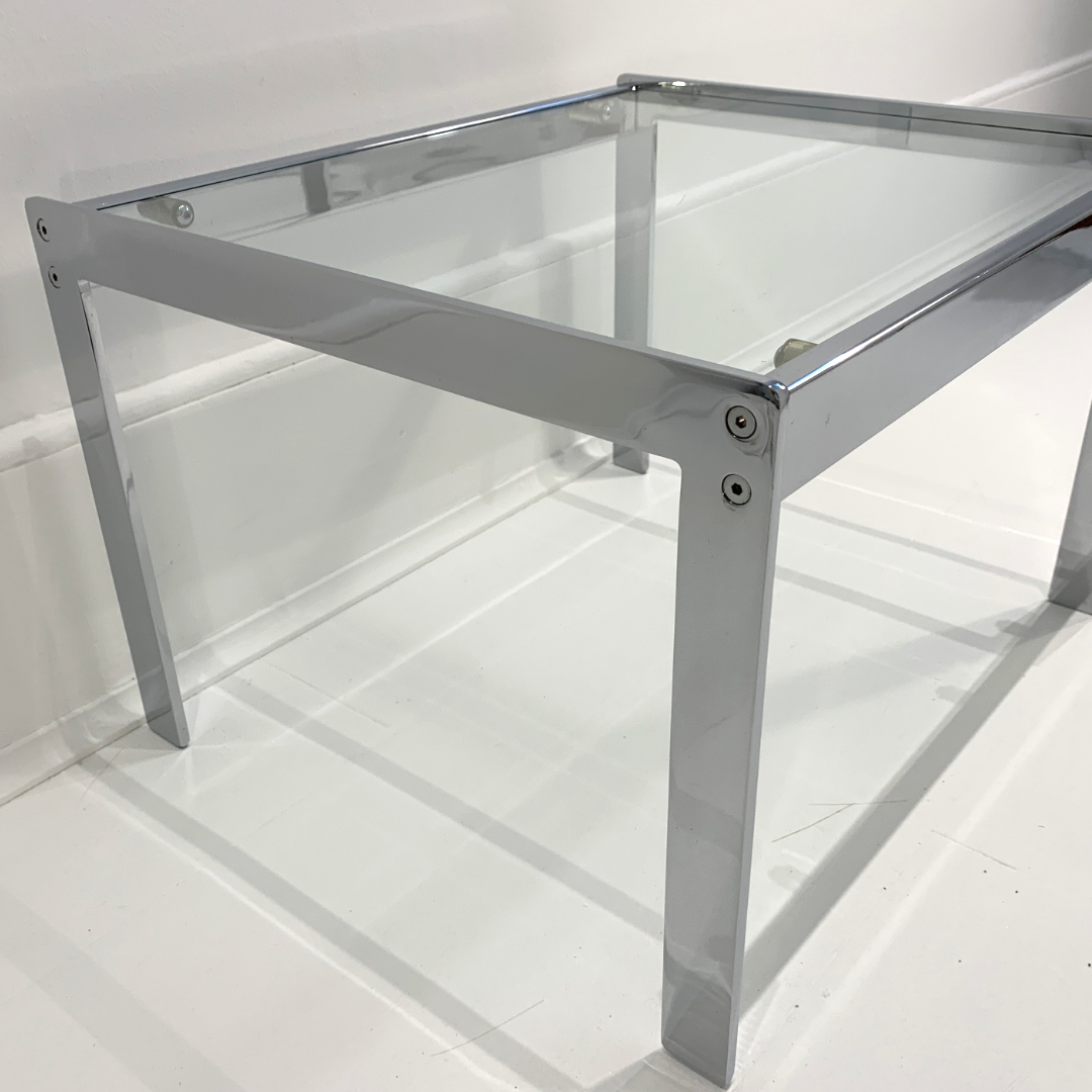 A small piece of British design history, created by Richard Young and produced by Merrow Associates in the 1960s. Ideal as a compact coffee table or side/end table. Features a sleek chromed steel base with a set-in glass top.