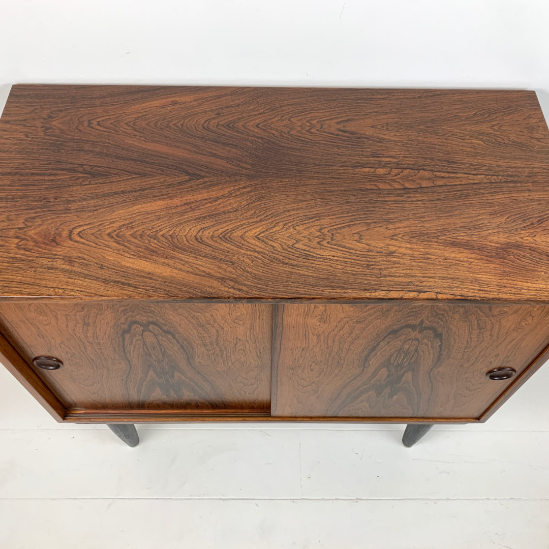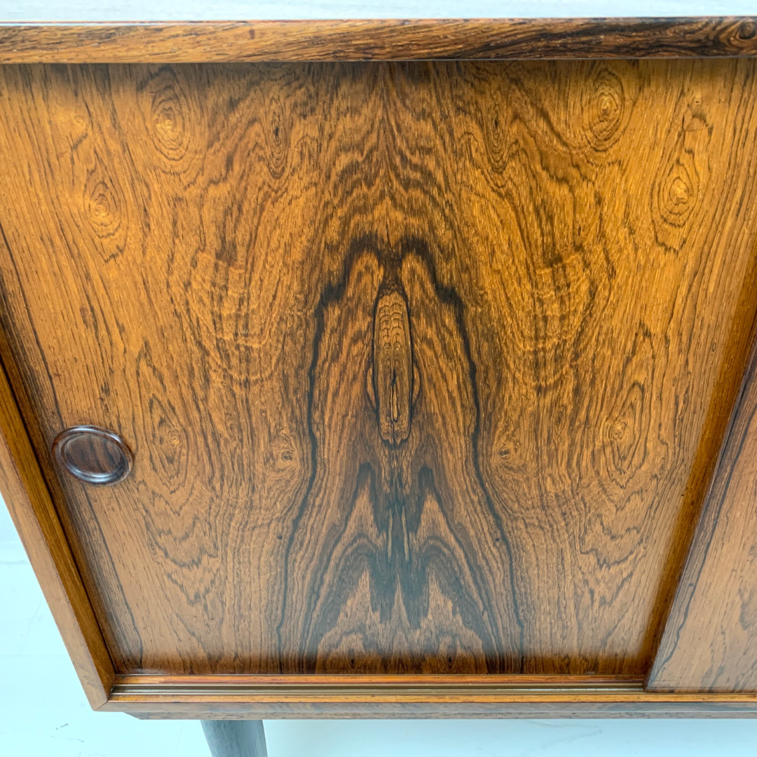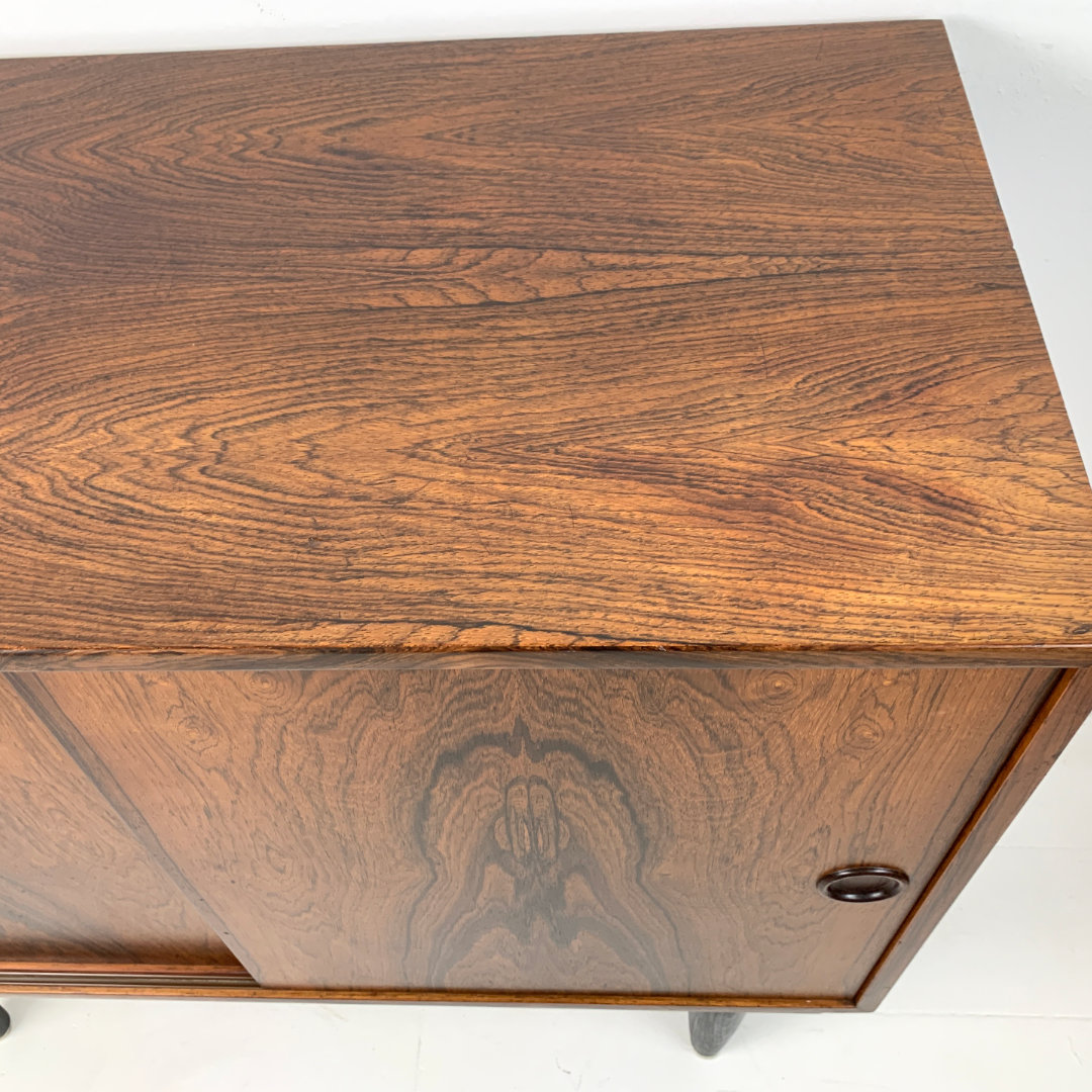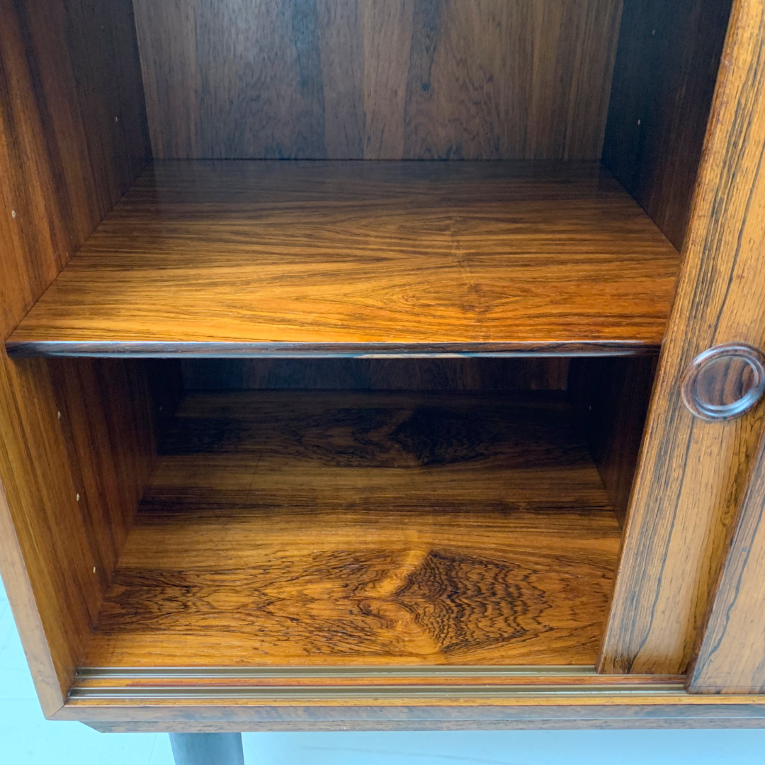 Beautiful mid-century modern Danish rosewood cabinet designed by Kai Kristiansen and made by Feldballes Mobelfabrik (FM). It features sleek sliding doors, a rich rosewood grain, and distinctive circular carved pulls. The interior is finished in rosewood veneer and includes height-adjustable shelves. The original maker's label is attached.